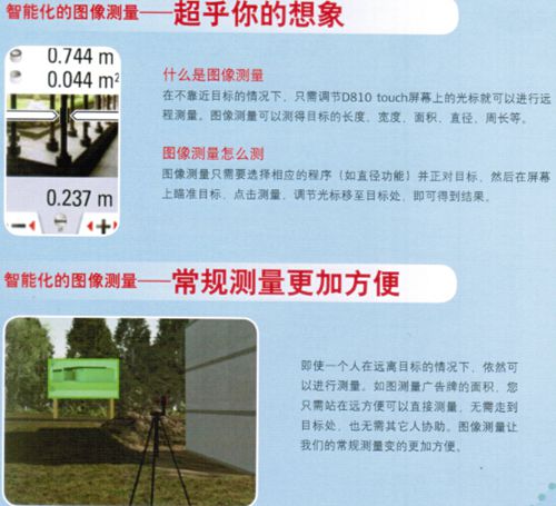徠卡迪士通D810 touch觸摸屏手持式激光測距儀是世界上唯一一款帶圖像測量的手持激光測距儀。它在不靠近目標(biāo)的情況下,調(diào)節(jié)D810 touch屏幕上的圖像光標(biāo)就可以進(jìn)行遠(yuǎn)程測量。圖像測量可以直接測量目標(biāo)的,長度、寬度、面積、直徑、周長等。 徠卡D810 touch具有高精度羅盤、舒適的彩色觸摸屏、四倍數(shù)碼瞄準(zhǔn)器、清晰的數(shù)碼照相功能、鋰電池充電、新一代藍(lán)牙4.0、徠卡Sketch軟件等諸多優(yōu)勢。這些功能讓測距儀不再是個(gè)工具而是儀器。